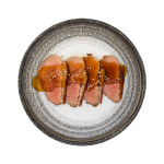 Lauw-warme, rosé gebakken eendenborst, in fijne plakjes gesneden en afgetopt met een huisgemaakte teriyakisaus. Een elegante combinatie van malse textuur en rijke, hartige smaken.