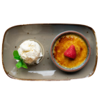 Zacht gegaarde vanille creme, afgebrand met bruine suiker, met een bolletje Vanille ijs